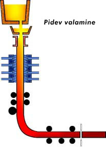 Once the refining process is complete, the contents of the converter are emptied into a crane bucket, and the steel is cast into a continuous casting unit. After the molten metal’s static pressure is reduced, it is allowed to cool in a quadrangular water-cooled copper mold. The steel solidifies immediately, forming a crust that is then fed through the mold’s base. The resulting quadrangular steel mass is drawn downward and sprayed with powerful jets of water until fully hardened. Guided by rollers on both sides, the steel is bent horizontally and cut to the desired length using an oxygen lance. The produced panels can be rolled into sheets.